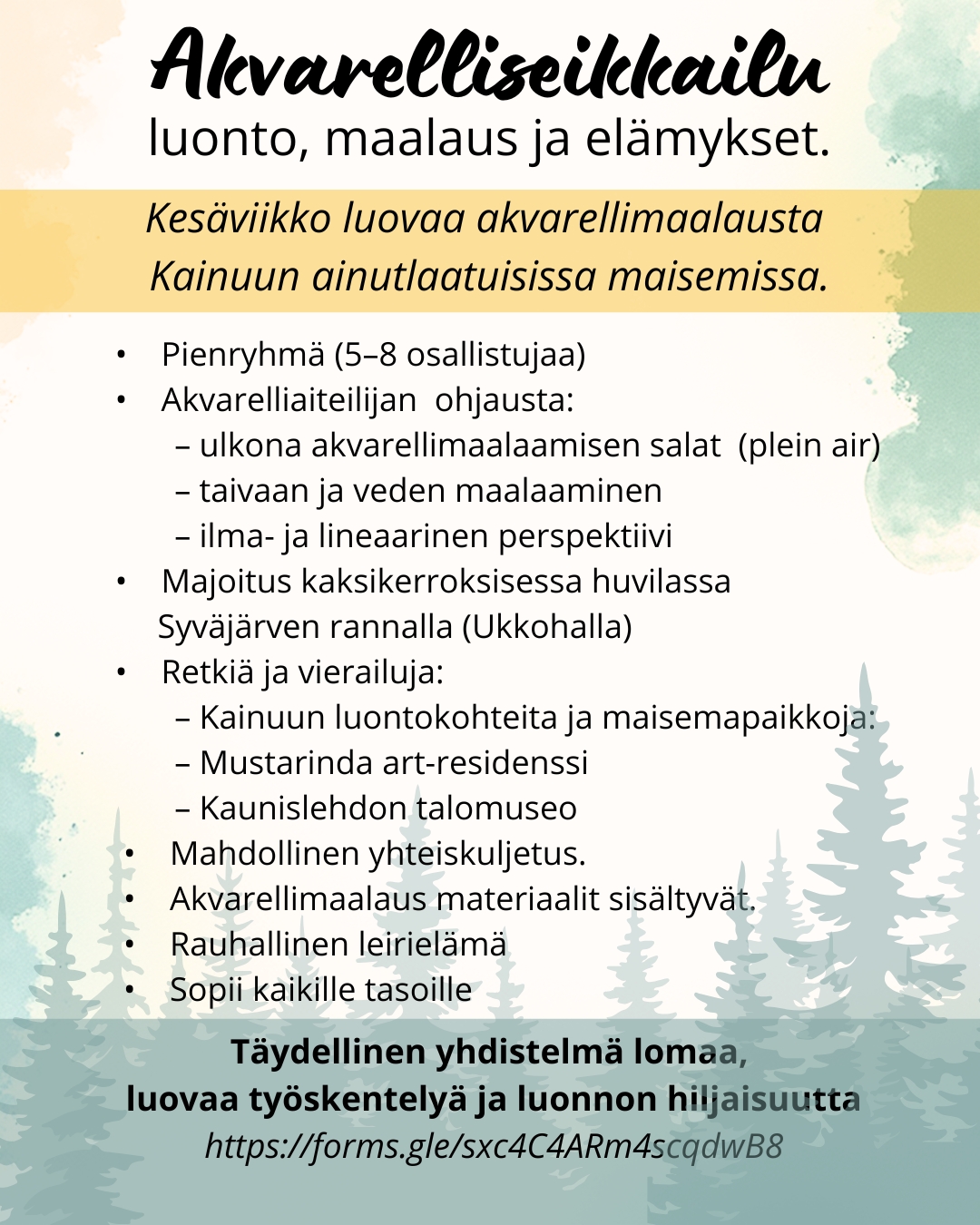Viiden päivän akvarellileiri ainutlaatuisessa Kainuun maisemassa: järviä, metsiä, avaria näkymiä ja hiljaisuutta, joka auttaa keskittymään olennaiseen.